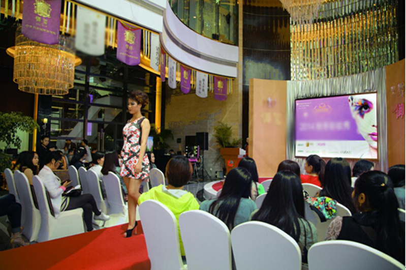 本期《当代女报》时尚学院以2014秋冬彩妆流行趋势为主题于2014年9月13日在逸翠园销售大厅内举行,首先由菁英化妆造型艺术培训学校的模特们为大家展示了2014年秋冬季彩妆主要流行的色彩搭配以及流行妆面。随后,妙巴黎的彩妆老师柳青现场为嘉宾们进行了一场彩妆课程,讲解日常彩妆的搭配技巧和操作要点。柳青老师一上场便直入主题,邀请现场嘉宾上场担任她的模特,通过实际操作,为大家分析化妆过程的细节以及各彩妆单品的使用技巧,同时结合模特的特点为大家分析了东方人脸型、五官的缺点如何通过彩妆进行弥补。生动的彩妆课程之后,雨齐美商的崔伟老师和助手一起和大家分享了如何自己DIY晚礼服,崔伟老师现场准备了布料、钉珠等工具,边讲边动手操作,神奇地将简单布料变成了模特身上的一袭拖尾晚礼服,让在座嘉宾们跃跃欲试。