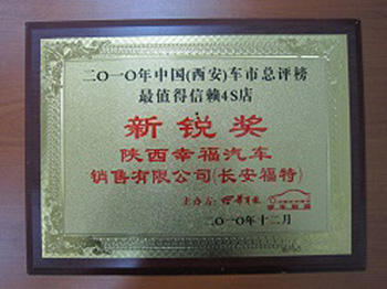 2010年12月10,由华商报主办的2010中国车市总评榜揭榜和颁奖仪式在易俗大剧院举行,陕西幸福榜上有名、实至名归。陕西幸福汽车销售有限公司荣获中国车市总评榜“最值得信赖4S店”,这是媒体包括广大消费者对陕西幸福的充分肯定和赞扬。