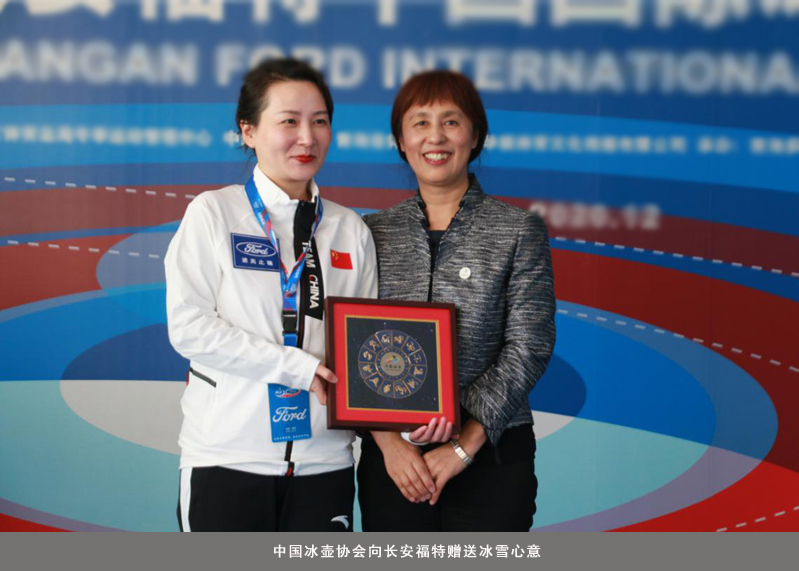 赵英刚先生、沙祖康先生、石钰女士分别致辞,共同为中国冰雪运动助阵,为中国冰壶健儿助威。此外,于海燕女士代表中国冰壶协会向冠名赞助商代表石钰女士赠送中国冰雪银盘和定制冰壶器材,对长安福特积极为本次赛事冠名赞助表示衷心感谢,祝愿长安福特宏图大展,蒸蒸日上。