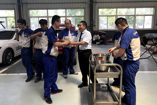 7月20日14:30,“大家都辛苦了,一起喝一杯饮料,袪袪暑气,可以无限续杯。”伴随着欣达汽贸副总经理助理孙晓丹的招呼声,“清凉一夏,爱在欣达”夏日送清凉活动拉开了序幕。孙助与工作人员一起将祛暑饮料和藿香正气液先后送到售后车间、销售展厅、以及职能办公人员的工位上,为他们送去一份清凉。销售展厅里,各销售顾问还进行了一场趣味十足的喝绿豆汤接力大赛。一位前来保养车辆的顾客喝了工作人员送上的绿豆汤止不住称赞说“味道美得很,再来一杯!”