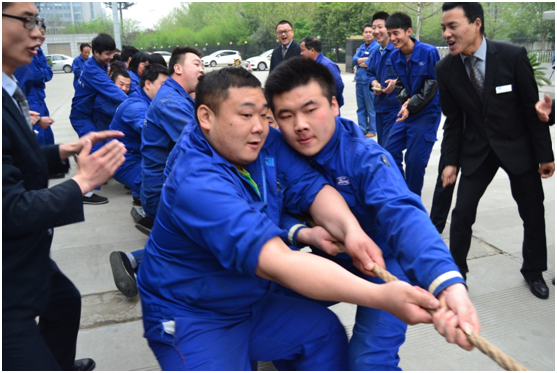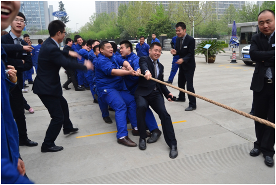 比赛共分为三支参赛队,由公司各个部门组成。三支队伍分别是:销售部、售后服务部以及职能部门。赛制采取三局两胜制。随着裁判的一声哨响,比赛场上顿时欢腾一片。第一轮是销售部和售后服务部的角逐,两个队伍的参赛人员个个卯足了劲儿,场上势均力敌,两支队伍的参赛人员都齐心协力,奋力比拼,最终售后服务部赢得了第一局比赛。伴随着大家热烈的呼喊声,最精彩的决赛在售后服务部与职能部门中展开,虽然职能部员工平均年龄较大,但仍然鼓足劲头,努力争取比赛的胜利,为团队争得荣誉,职能部拉拉队不停地为他们的团队呐喊助威,现场气氛达到了高潮。比赛最后,售后服务部以两局连胜的结果夺得了此次拔河比赛的冠军。
