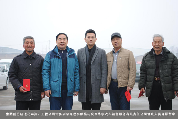 由集团公司副总经理马琳翔带队,与工程公司常务副总经理李顺强等先后前往集团本部、汽车管理公司、陕西华宇汽车销售服务有限责任公司、工程公司及各项目部向值班员工送去董事长和集团的关心与新春祝福,感谢大家过去一年里的工作付出和努力,希望大家认真履行岗位职责,做好节日期间的安全、消防防范工作,确保度过一个瑞气、祥和、喜庆的新春。鼓励大家在新的一年里,做好本职工作,为企业发展凝聚力量。