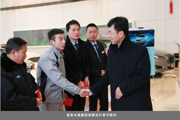 董事长携集团高管首先到达陕西幸福汽车销售有限公司进行慰问。董事长与值班人员亲切握手并发放新年红包,感谢各位同仁一年来为公司发展付出的辛劳和努力;高度认可并赞扬了2016年度在集团的指导和公司负责人的带领下取得的成绩。董事长在慰问中说到:“期望每一个团队都是一支 ‘风清气正’的团队,在2017年创造更加辉煌的业绩。”从幸福汽贸结束慰问后,董事长一行分别前往欣达汽贸、福迪汽贸(北二环店和明光路店)及豪林林肯进行了节日慰问。在福迪明光路店慰问中,董事长特别询问了福迪安保团队节日期间伙食安排,肯定了福迪安保团队在2016年的工作,并希望安保团队在2017年再接再厉。
