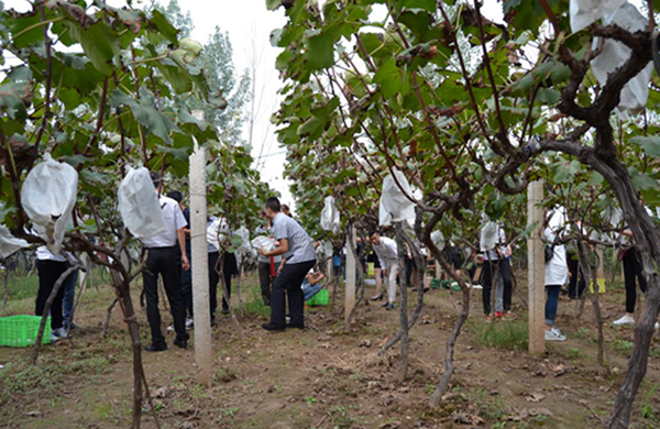 下午13:30分,参加活动的员工准时出发。经过一小时的车程,顺利到达了户县葡萄采摘园。为增加活动的趣味性和互动性,行政部邹经理按照工作职能将员工分为三个小组,给大家简要讲述了游戏规则和注意事项,员工们兴高采烈的进入葡萄园。