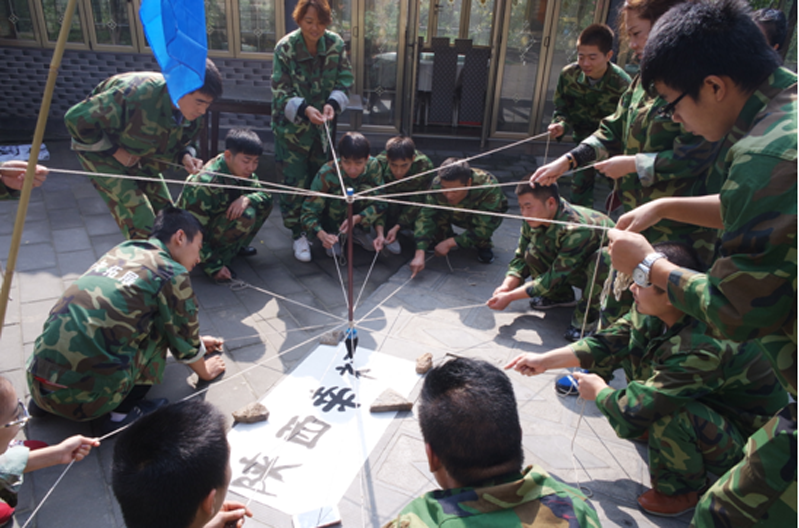 第一个拓展项目是万众一心。这个项目要求每位队员手执一端绳子,共同拉动绑在绳子中间的大毛笔,写出“陕西幸福”四个大字,这个项目的完成需要细心、耐心。所有人屏息凝神慢慢的拉动手中的绳子,和团队的小伙伴一起合作,写出漂亮的“陕西幸福”,完成项目的员工都露出满意的笑容。