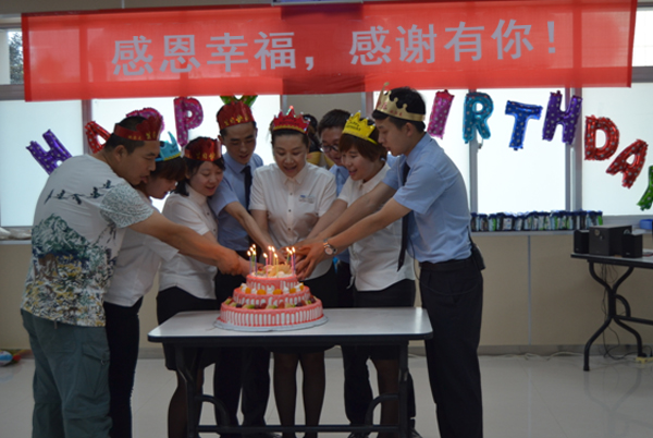生日会由问题抢答、员工互动、蛋糕分享、赠送礼物、集体游戏、合影留念等环节组成。问题抢答环节,大家争相抢答主持人提出的有关企业文化理念方面的问题。员工互动环节,在主持人的邀请下,新加入幸福大家庭的员工分别做了自我介绍、并讲述了自己对陕西幸福汽车销售有限公司的第一印象及感受,在集团工作18年之久的行政经理邹蓉为大家分享了她这18年的工作心得。在充满彩球、烛光、音乐、心愿、喜悦、相互祝福的现场,在大家一起唱响生日歌之后,大家分享了甜美的生日蛋糕,并领取到了公司领导赠予的生日礼物。在紧张激烈的“抱团”游戏过后,生日会进入了尾声。在《相亲相爱一家人》音乐声中,在热闹、祥和的氛围下,参加活动的全体人员进行了合影留念。