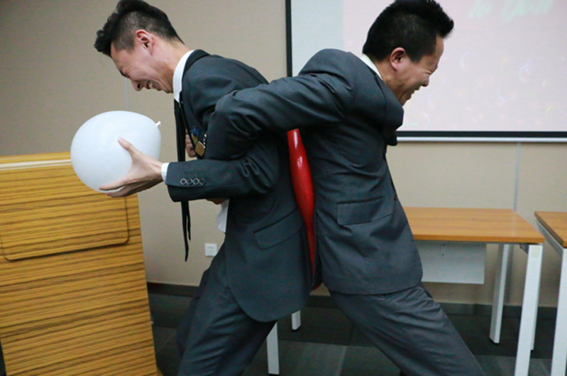 游戏环节更是引人入胜,游戏——泡泡糖打破了寿星之间的陌生感,让彼此迅速熟络起来;让乒乓球飞更是将本次生日会推向高潮,各种搞笑的爆破音不断蹦出“我呸”、“扑通”、“扑倒”……有些参与游戏的寿星还没说出词语便笑弯了腰,还有一位同事对着水杯大喊“葡萄”,乒乓球和水应声而出,打了对面摄影师一个措手不及,场下观众更是笑声一片。游戏接近尾声,胜负已见分晓,获胜的队伍赢得了精美的纪念品,失败的队伍必须接受小小的惩罚——爆气球。只见豪林市场部经理谢怡慷与豪林顾客体验部主管田飞两人玩起了背靠背,气球被夹在中间,二人使出了九牛二虎之力,气球依然完好无损,围观的吃瓜群众也是笑到不能自已。
