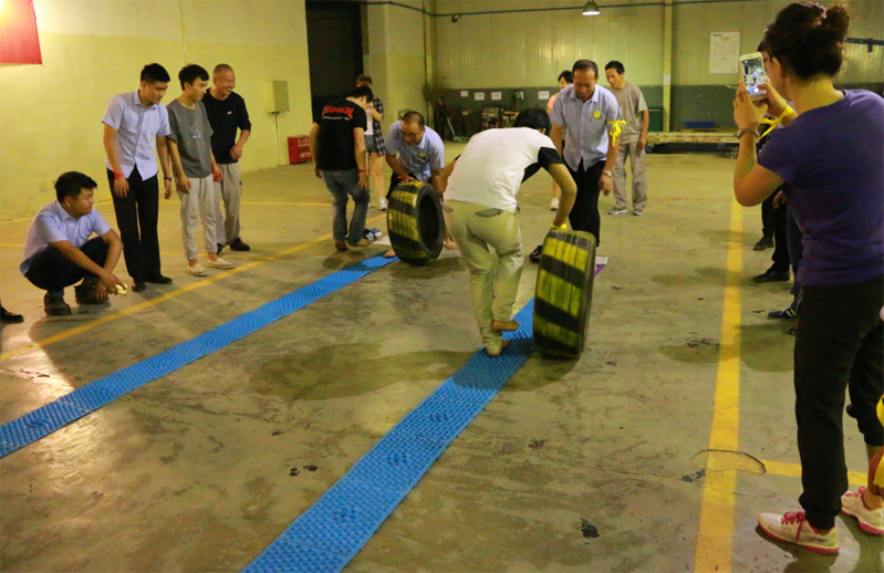 “痛并快乐”以及“穿越呼啦圈”,分别让不同的队伍在指压板上滚轮胎和传送呼啦圈,每一位参赛人员不但要忍受着如行针毡的痛苦,还要赤足在指压板上做出惊人的演绎。特别是“穿越呼啦圈”,是一个人数为50人的大型娱乐项目,在两队队长有效的战术指导下,每个人切切实实“享受”着痛并快乐的足底按摩,最终把呼啦圈送到了终点。