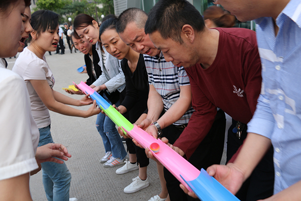 本次员工趣味运动会共设置珠行万里、行走的呼啦圈、男子组/女子组拔河三个比赛项目,销售部、售后部、职能部三支代表队参赛。比赛正式开始前,各参赛队逐一进行了风采展示,“奇胜队”、“强击队”、“绝地求生队”, 队名充满个性与活力,队呼响亮而振奋,大家士气高昂、信心满满。主持人宣布完比赛规则,比赛正式开始。首先进行的是“珠行万里”,各参赛队利用手中的管槽形成渠道,以接力的形式将球从起点运输至终点目标桶。销售部、售后部同时上场比拼,刚开始大家觉得很简单,实际运送的过程由于大家的慌乱球总是脱离轨道,一次、两次、三次都失败了。队员们不气馁也不放弃,大家吸取教训不断调整轨道坡度,控制球速。在队长的带领下,队员们由之前的慌乱无序到最后的沉着有序,由一边的接力变为两边的互补,还专门安排一个队员在目标终点等待接应,每个队员分工明确,目标清晰,赛场上大家齐心协力,没有参赛的啦啦队队员,也在积极出谋划策,加油呐喊,比拼气氛异常紧张。销售部在经过多次的调整和队员的默契配合下,第七次终于成功完成挑战,用时4分29秒!售后部、职能部也不甘落后,不断调整,在队员的全力配合下,最终完成挑战。