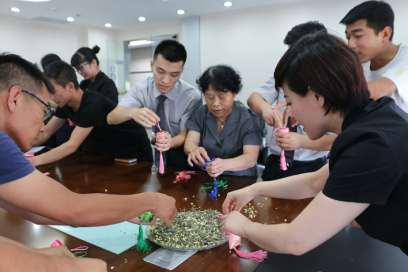 为促进同事间的互动,增进彼此间的感情,大家将亲手DIY的香包互赠对方,过程中,内敛的同事相邻互赠,开朗的同事面对面互赠,或挂在对方的工牌上,或挂在对方的耳朵上,或挂在对方的腰间,并给对方一个真诚的拥抱,互赠一句“端午安康”,此时此景,轻松愉悦,让彼此感受到一次别样的端午问候。在互赠结束后,各部门的同事仍心系因公外出或辛苦在一线的同事们,帮她们制作香包,将这份浓浓的祝福寄托在她们朴实的行为中,再一次升华了真诚、合作、和谐的人际环境。